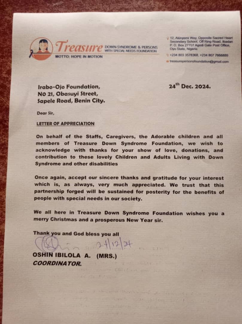 Irabor Ojo Foundation donates Gas cooker and other items to Treasure Down Syndrome & Persons With Special Needs Foundation. Ibadan, Oyo State on 24th December, 2024.